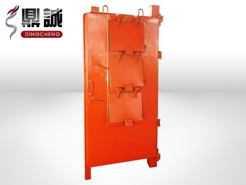 2.門扇上部裝有三組通風(fēng)活門裝置,即在活門底板開(kāi)有三組共18個(gè)直徑122mm的通風(fēng)孔,活門板外部裝有自動(dòng)張開(kāi)12度角的活門懸板。每組活門通風(fēng)量為2000立方/h,總通風(fēng)量為6000立方/h,風(fēng)速按8m/s進(jìn)行設(shè)計(jì),使用時(shí)可根據(jù)井下bao破材料庫(kù)需要風(fēng)量和總回風(fēng)道負(fù)壓值,確定通風(fēng)活門組數(shù),并可調(diào)節(jié)每組活門懸板的張啟角度進(jìn)行微調(diào),以滿足通風(fēng)量。當(dāng)庫(kù)內(nèi)一旦發(fā)生baozha,沖擊波經(jīng)過(guò)衰減后,余壓只要大于20KPa時(shí),活門懸板受壓再3-8s內(nèi)自動(dòng)關(guān)閉,與外界隔離,組織baozha抗沖擊波及爆炸產(chǎn)生火焰,有毒氣體向外部巷道擴(kuò)散,由總回風(fēng)道排出。
